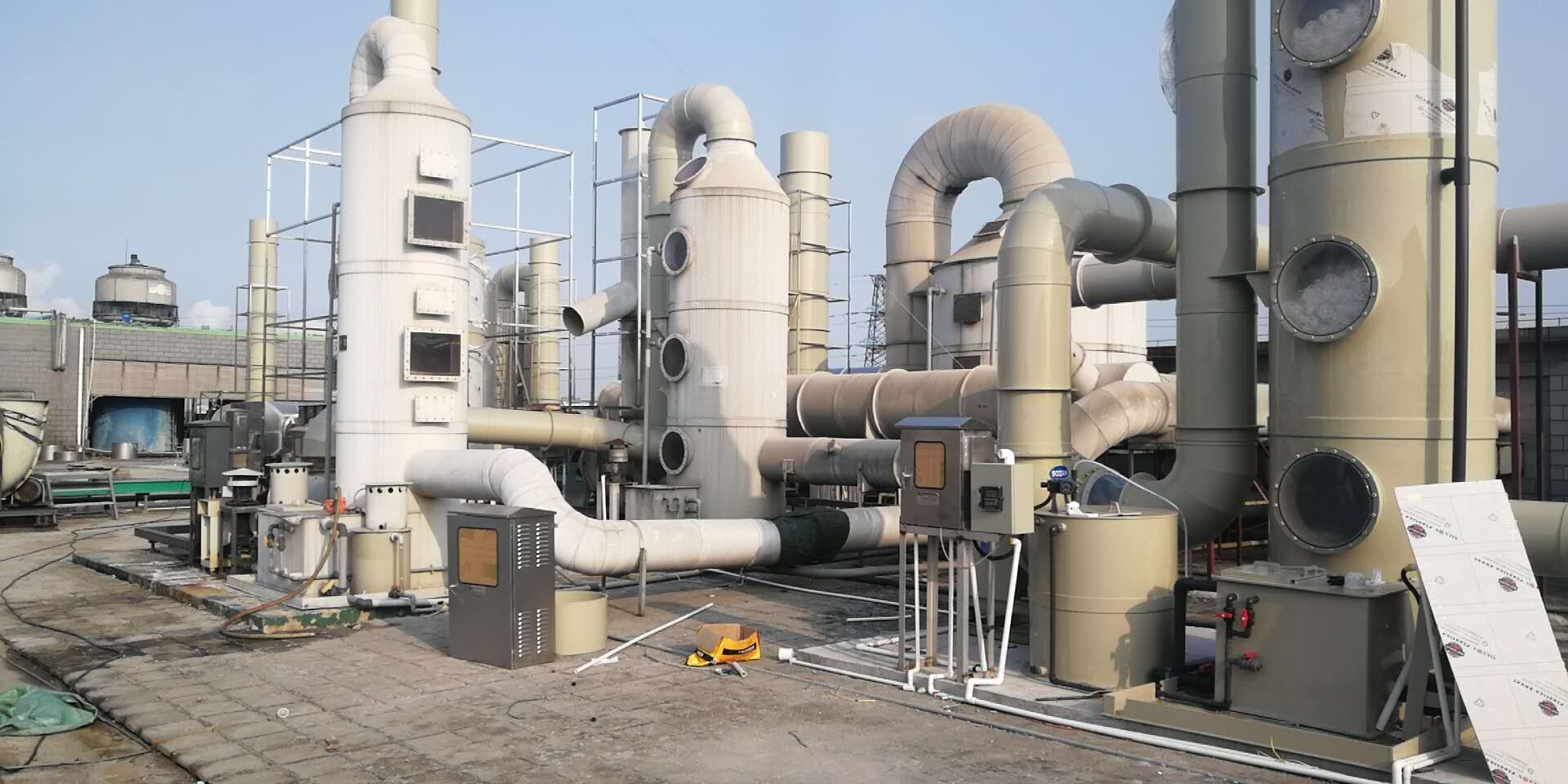 對(duì)於腐蝕(shí)性氣體(如(rú)酸、堿性廢氣)的治理,多采用PP廢氣處理塔治理(lǐ)。采用液體吸收法治理該廢氣(qì),關鍵在(zài)於淨化設備的選(xuǎn)擇。我公司自(zì)主開發了淨(jìng)化效率高、操作管理簡單、使用壽命長的酸、堿性廢氣淨(jìng)化工藝(yì)與設備。該(gāi)工藝與產品具(jù)有結構簡單、能耗低、淨化率高和適用範(fàn)圍廣的特點,能有效去除氯化氫氣體(HCI)、氟化氫氣體(HF)、氨氣(NH3)、硫酸霧(HzsO4)、鉻酸霧(Cr03) 、氰氫酸氣體(HCN)、堿蒸氣(qì)(Na0H) 、硫化氫氣體(HLs)等水溶性(xìng)氣體。
